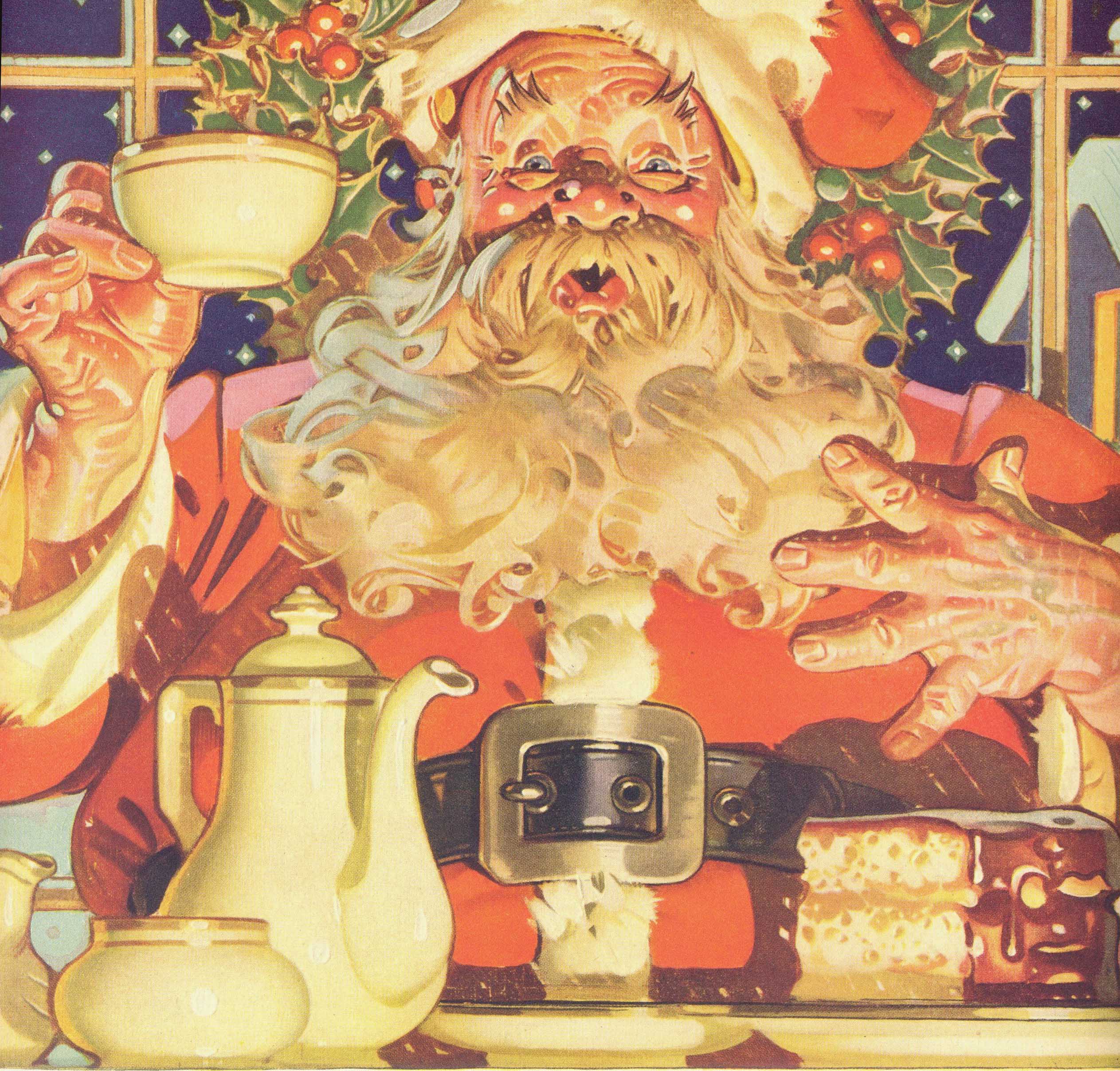marks: teapot and squarish plate marked “Salem China Christmas Eve original by Viktor Schreckengost” with a green and red wreath on base; round plate “Salem English Bone China Christmas Eve Salem England”; gravy marked “Salem Swirl”; lidded sugar marked the same as teapot except with gold wreath; saucers unmarked; cup/mug marked with green and red wreath encircling “Salem”; ashtray/nut dish marked with Santa in gold on base “1966 Seasons greetings from Salem #15”