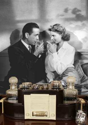 Caption: 1940s Porto Baradio, combination bar and radio, Bakelite case with radio, 2 decanters, ice cube holder, 6 tumblers, and 4 shot glasses, H: 10.5” L: 24” W: 10” Museum Purchase 2016.26.